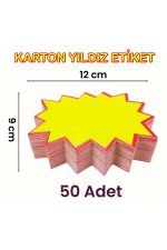 Sarı Yıldız Etiket 50 adet 9×12 cm Sarı Yıldız Karton Fiyat Etiketi, Mağaza, Bakkal ve Süpermarket Boş Yıldız Etiketi Yıldız Etiket 9×12 ; Market ve mağaza içerisinde indirimde olan ürünler için bir satış potansiyeli yakalamak veya belli bir grup ürünün satışını arttırmak için kullanılır.; Ürün raptiye, bant vs gibi malzemelerle mağaza içerisinde herhangi bir alana asılabildiği gibi mağaza dışarısında da cam, tente gibi alanlarda kullanılabilir.; Ürün yazılan yazıyı net ve parlak gösterecek ve yazıyı yaymayacak özel kağıttan üretilmiştir.; Malzeme : Karton Kullan At ( Yaz / Sil Değildir.; ) Ebat : 9×12 cm