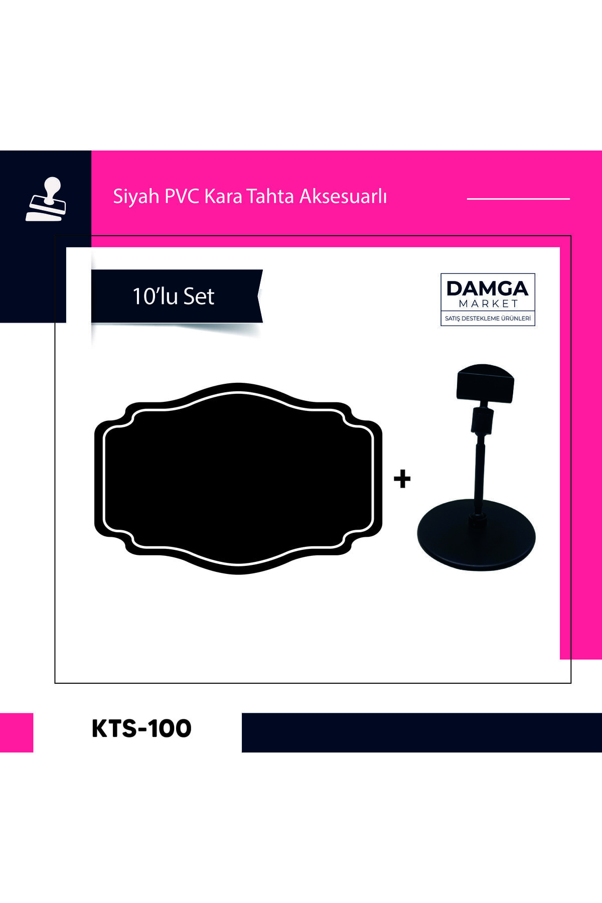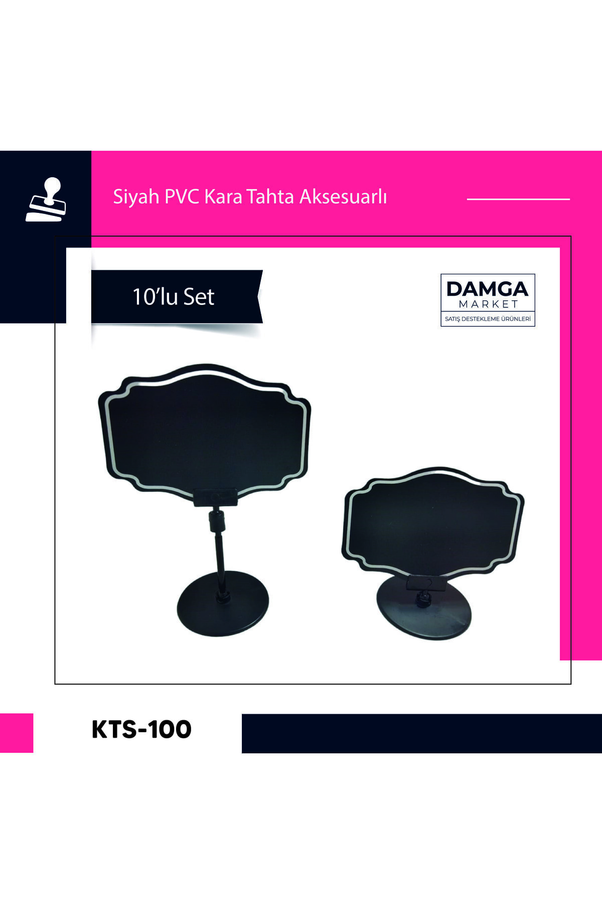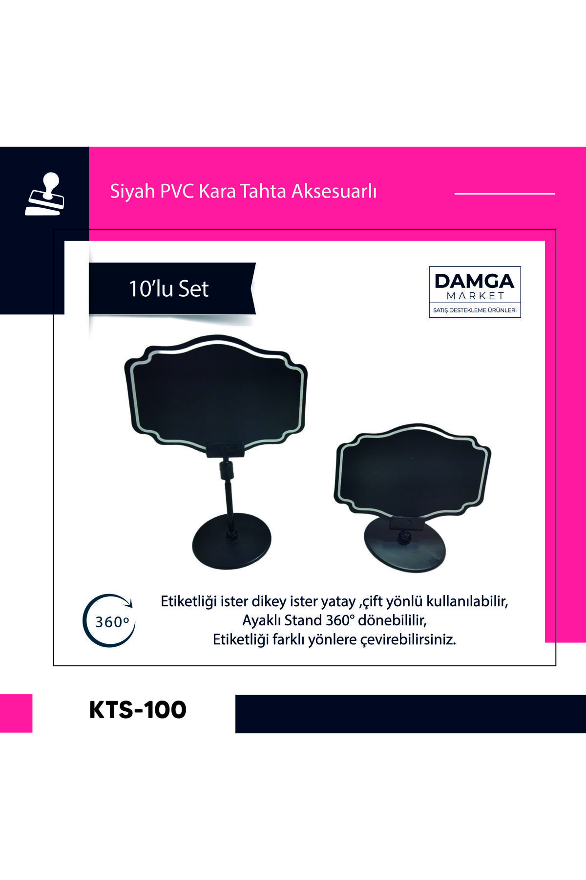 DamgaMarket Siyah Pvc Fiyat Etiketleri – Silinebilir, Yeniden Yazılabilir, Yuvarlak Ayaklı Pvc Levha, 8cmx12cm – 10 Adet Paket DamgaMarket Siyah Pvc Fiyat Etiketleri, işletmenizin düzenini sağlamak ve ürün fiyatlarınızı profesyonelce sunmak için ideal bir çözümdür.; Silinebilir özelliği ile fiyat değişikliklerine hızlıca adapte olabilir ve yeniden yazılabilir tasarımıyla ekonomik bir çözüm sunar.; Anahtar Özellikler: Silinebilir ve Yeniden Yazılabilir: Siyah PVC malzeme, üzerine yazılan bilgilerin kolayca silinip, yeniden yazılmasına olanak tanır.; Bu özellik, fiyat değişikliklerini hızlı ve pratik bir şekilde yönetmenizi sağlar.; ; Yuvarlak Ayaklı Pvc Levha Tasarımı: Yuvarlak ayaklar, etiketinizi sabit bir şekilde tutarak düşme veya kayma riskini en aza indirir.; Bu tasarım, etiketlerinizi düzgün bir şekilde sergilemenize yardımcı olur.; ; Boyut ve Miktar: Her etiketin boyutu 8cm x 12cm’dir.; Bu paket, içerisinde 10 adet siyah Pvc fiyat etiketi ve yuvarlak ayaklı stand içerir, bu sayede ihtiyacınıza uygun miktarda etiket kullanabilirsiniz.; ; Çeşitli Kullanım Alanları: Perakende mağazaları, süpermarketler, marketler, butikler ve diğer perakende işletmelerde kullanılabilir.; Fiyatları net bir şekilde sergilemek ve güncellemek için idealdir.; ; Dayanıklı ve Estetik: PVC malzemenin dayanıklılığı, uzun ömürlü kullanım sağlar.; Siyah renk, etiketlerinizi vurgulamak ve profesyonel bir görünüm elde etmek için idealdir.; ; Nasıl Kullanılır: Etiketleri ürün rafına veya tezgaha yerleştirin.; ; Üzerine ürün adı, fiyat veya diğer bilgileri yazın.; ; Fiyat değişiklikleri veya güncellemeleri hızlıca yapmak için yazılabilir yüzeyi kullanın.; ; Yuvarlak ayaklı tasarım sayesinde etiketleri sabit bir şekilde tutun.; ; DamgaMarket Siyah Pvc Fiyat Etiketleri, işletmenizin profesyonel görünümünü destekler ve fiyatlandırma süreçlerinizi daha etkili hale getirir.; Estetik tasarımı ve kullanışlılığı ile perakende ortamınızı düzenlemeniz için mükemmel bir seçenektir.; Siz de DamgaMarket kalitesiyle işletmenizi daha organize ve profesyonel bir hale getirin!